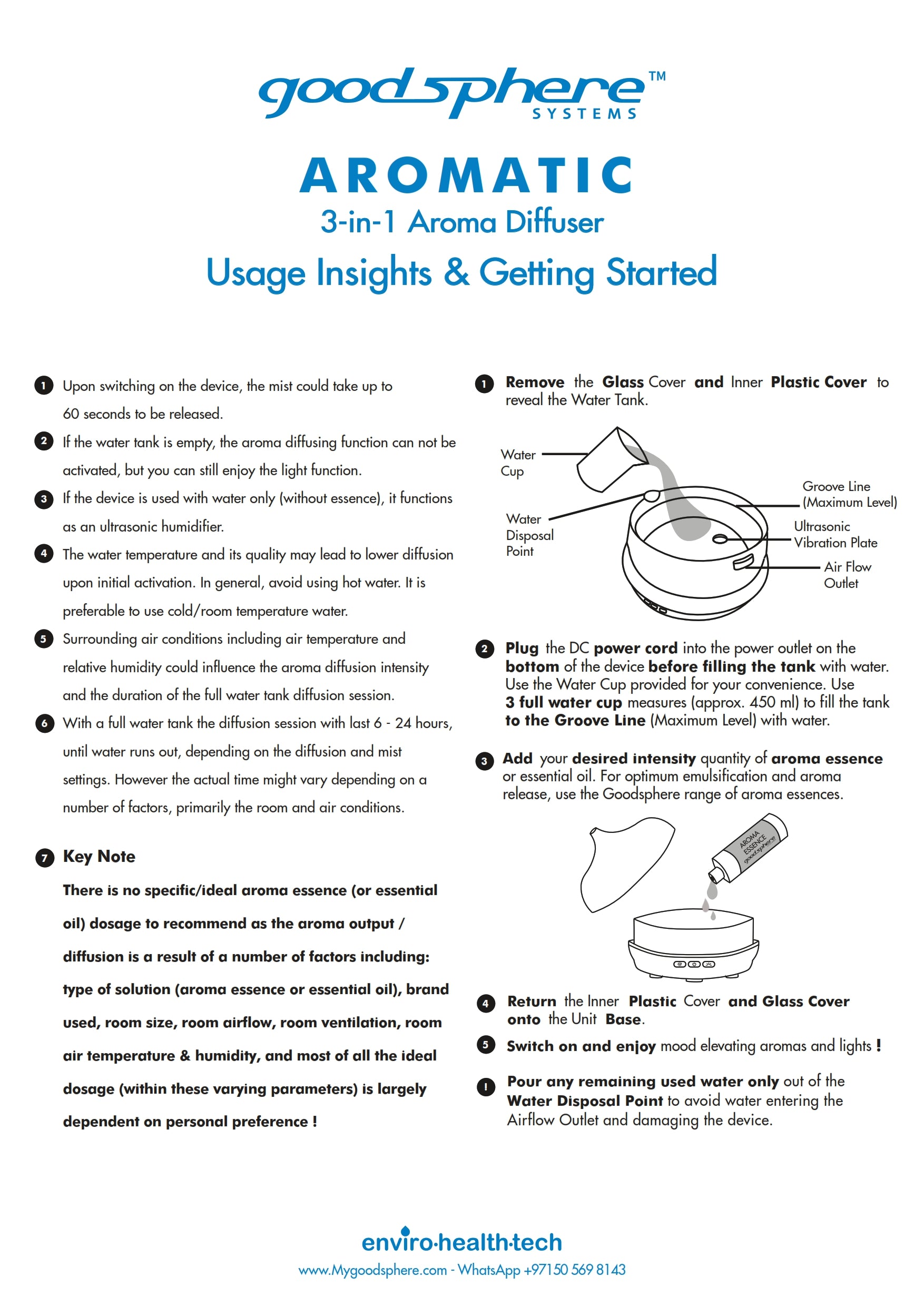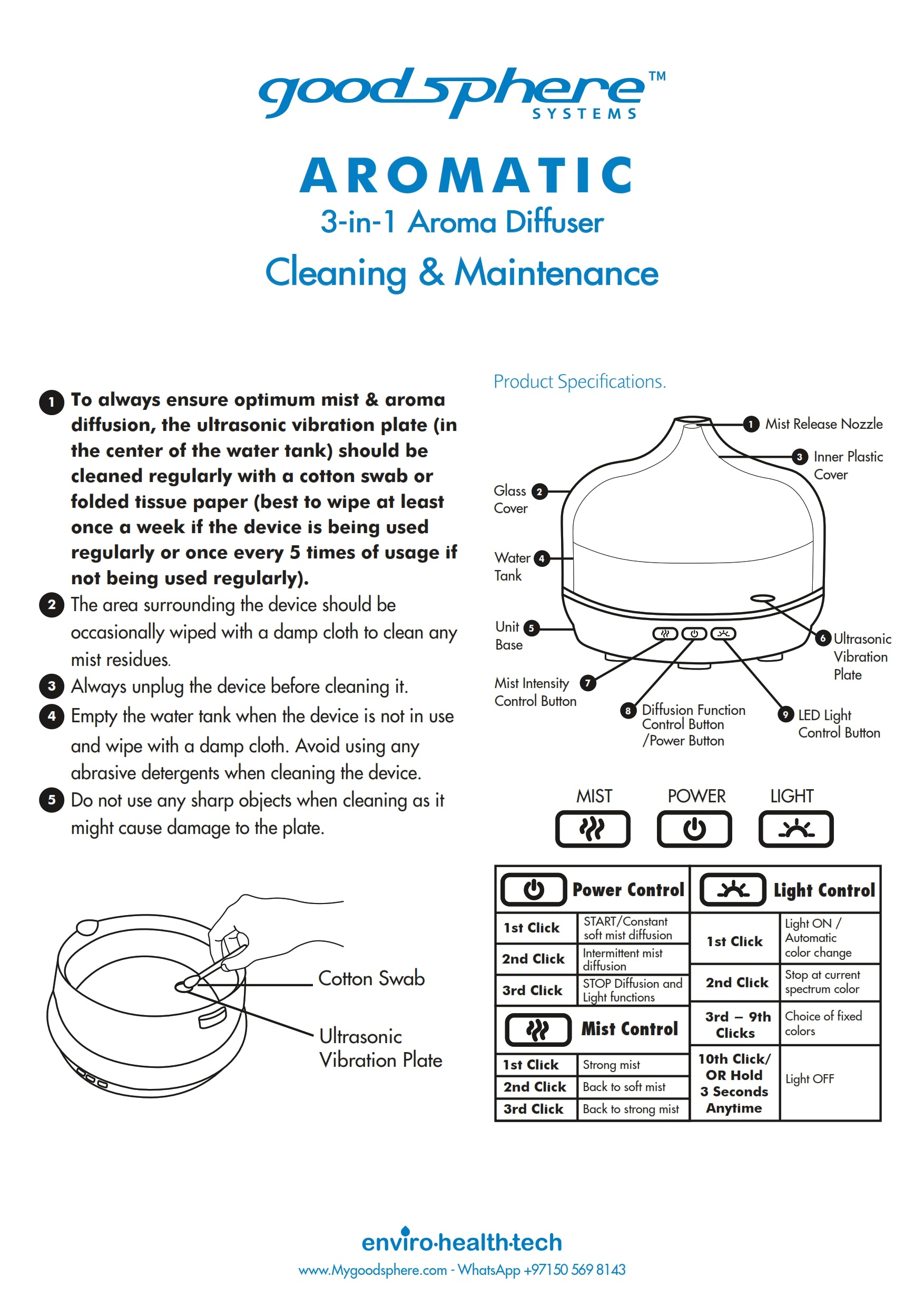 Use with essence for full diffusion or with just water as a humidifier. Lighting functions independently.
